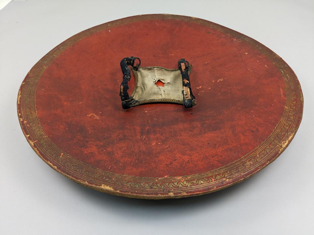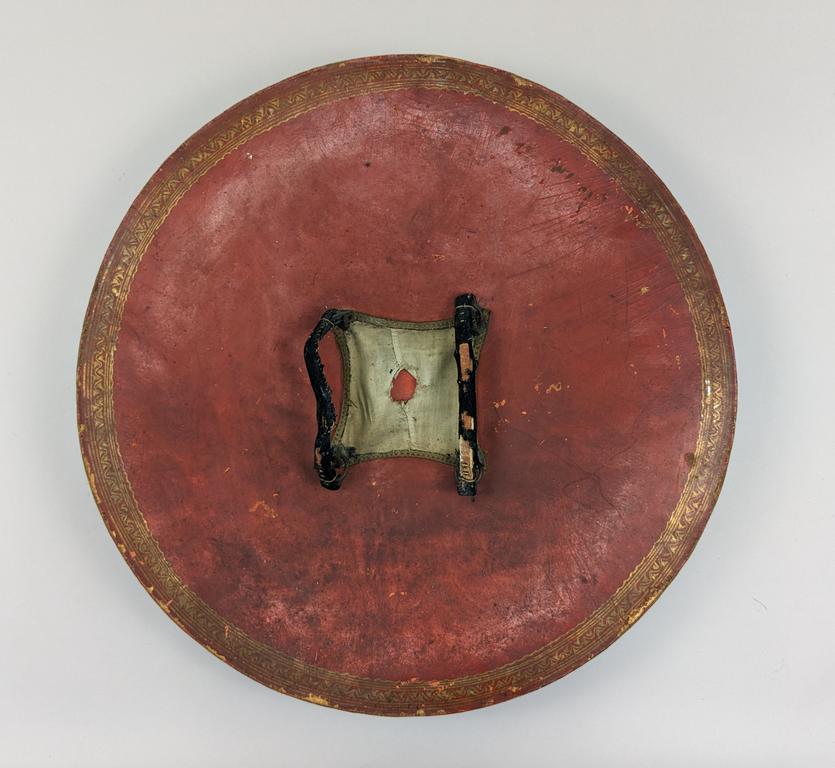 19th C. Indo-Persian Leather Dhal Shield. Circular, black lacquered leather shield with four raised bosses, tooled central medallion and border, and horsehair mane decoration. The red lacquered interior has four eyelet strap mounts and a gilt painted border. Dimensions: 24 inches diameter by 3 inches height.