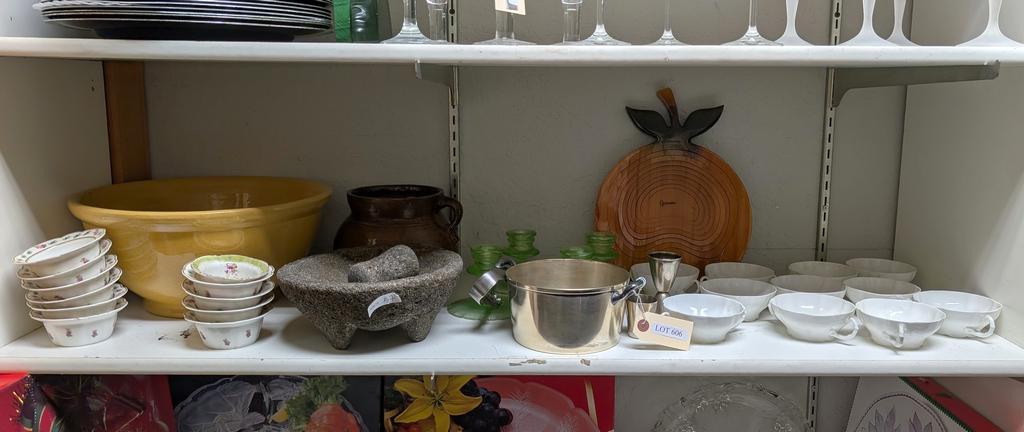 Lot 606: Shelf of Dishware Incl. Nathan Dohrman Dessert Dishes, Mortar & Pestle.