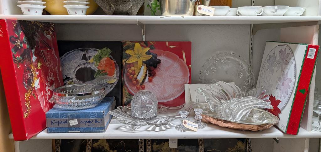 Lot 609: (2) Shelves of Barware and Christmas Glassware.