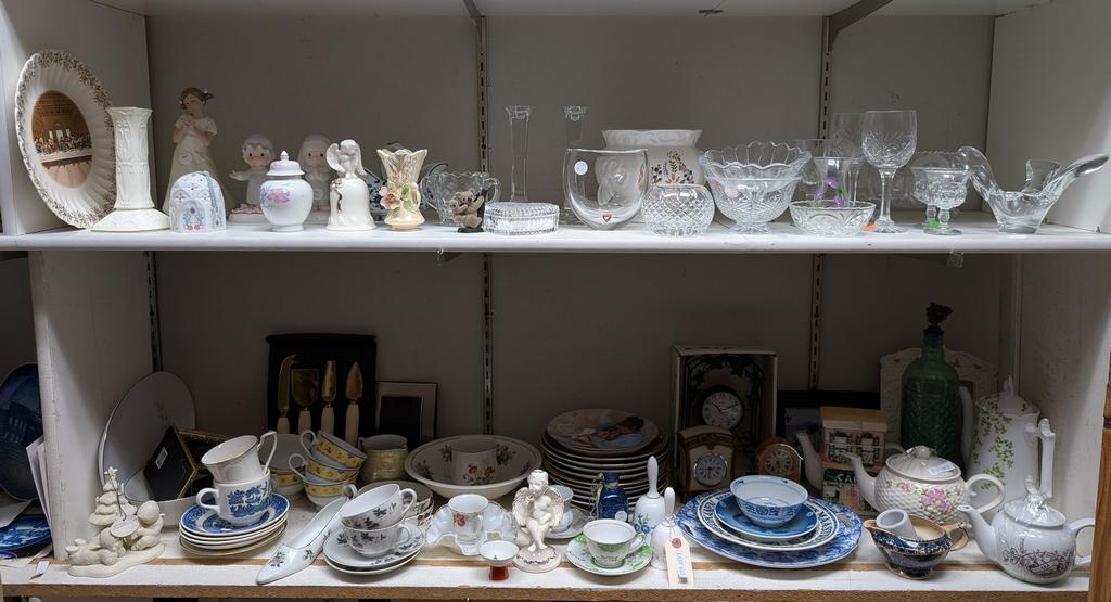 Lot 615: (2) Shelves of Decorative Items Incl. Bone China Bells, Clocks.