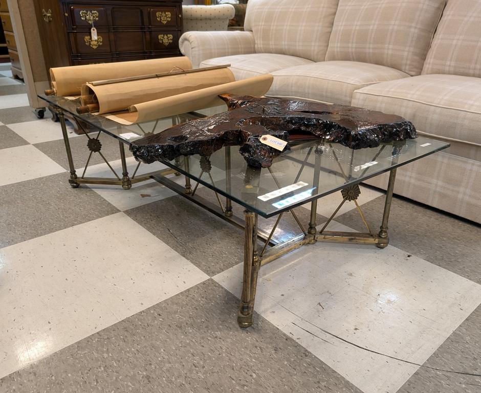 Lot 641: Rectangular Glass Top Coffee with Metal Base and Floral Medallions.