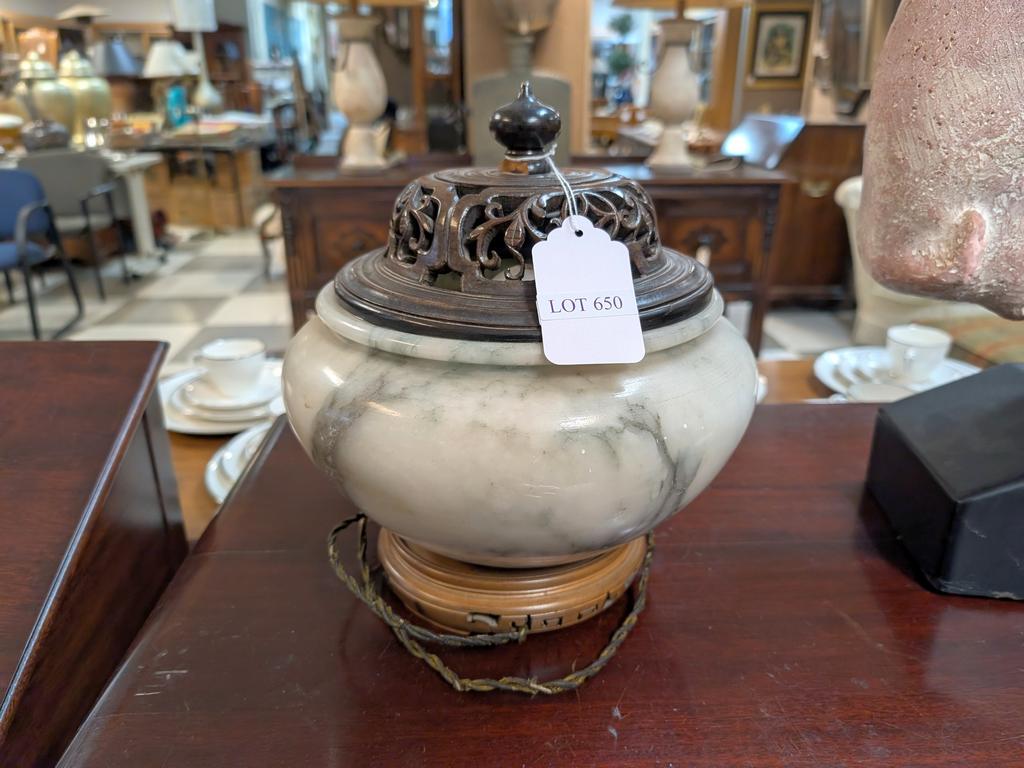 Lot 650: Alabaster Lamp with Carved Wood Lid and Base.