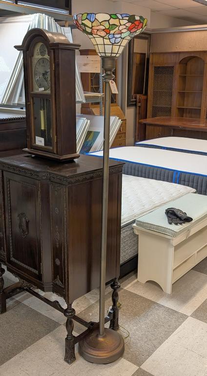 Lot 763: Contemporary Metal Torchiere with Stained Glass Shade.