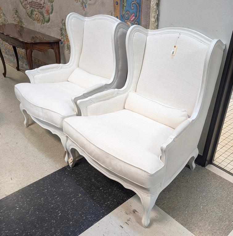 Lot 766: Pair of Wing Back Armchairs with White Upholstery.