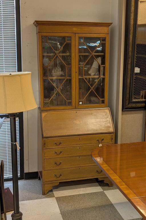 Lot 771: Inlaid Mahogany 4-Drawer Drop Front Secretary Bookcase.