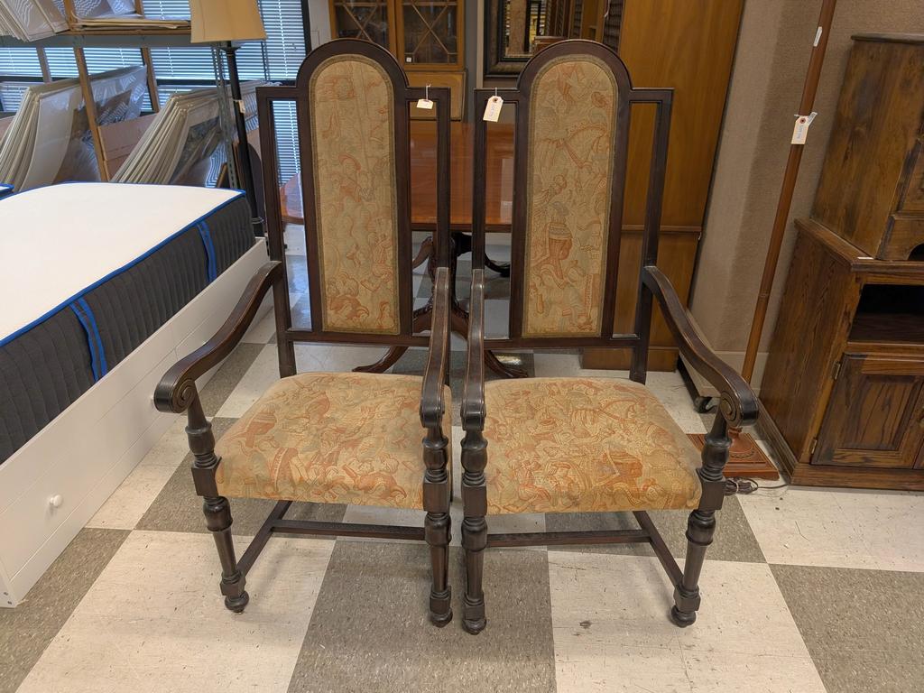 Lot 775: Pair of Mahogany Tall Back Armchairs with Tapestry Upholstery.