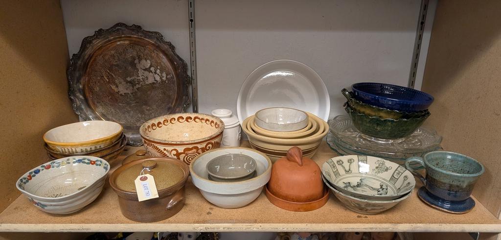 Lot 783: Shelf of Pottery Bowls, Dishware and Serving Tray.