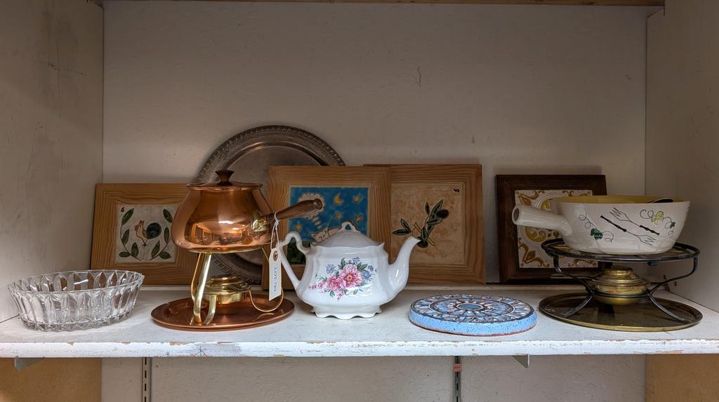 Lot 789: Shelf of Knick Knacks Incl. Ceramic Tiles, Fondue Pot.