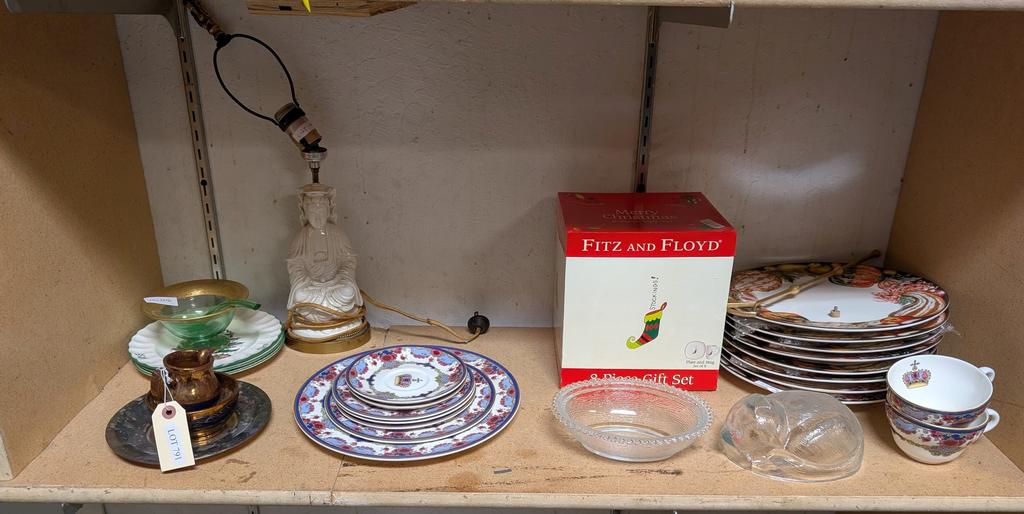 Lot 791: Shelf of Dishware Incl. Fitz & Floyd Holiday Gift Set, Royal Doulton.