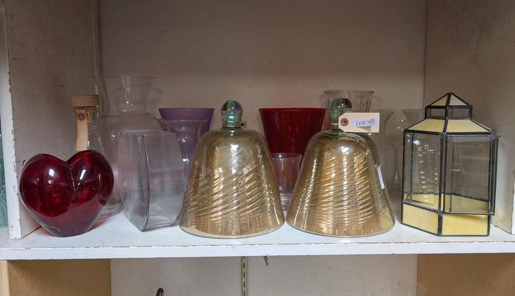 Lot 797: Shelf of Glass Vases and Decorative Items.