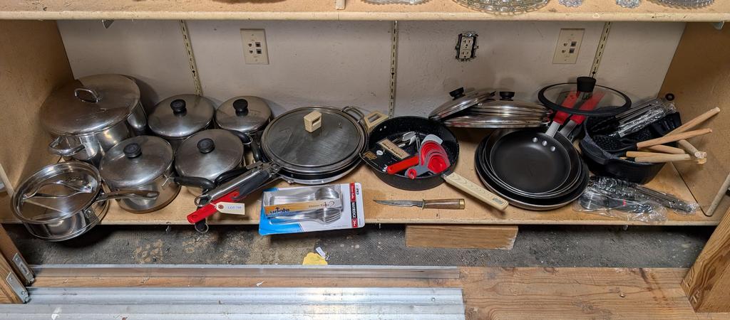Lot 799: Large Shelf of Cookware Incl. Pot & Pan Sets.