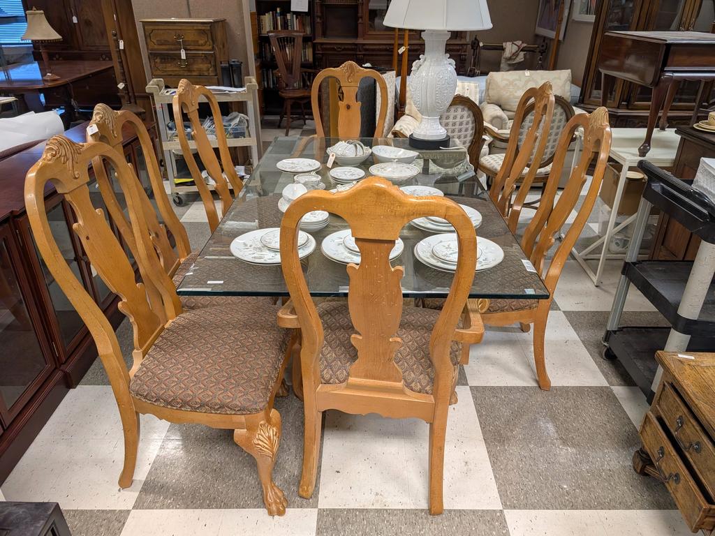 Lot 858: Glass Top Pedestal Table and 8 Pine Dining Chairs.