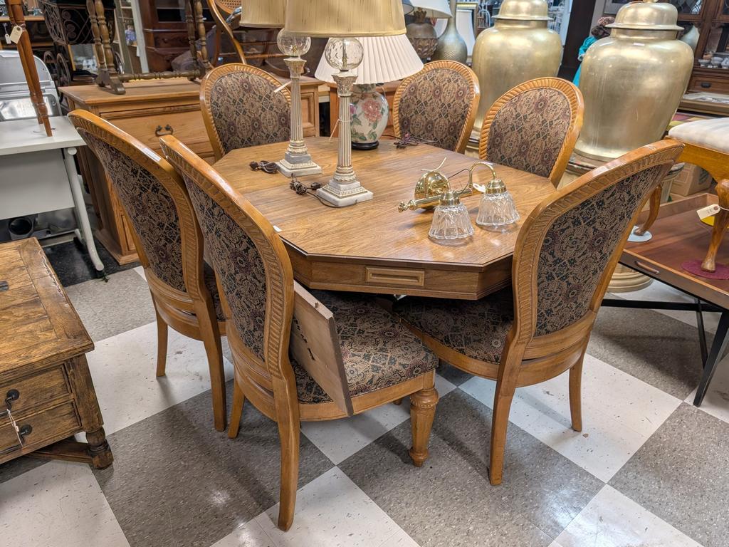 Lot 868: Oak Octagonal Dining Table with 2 Leaves and 6 Chairs.