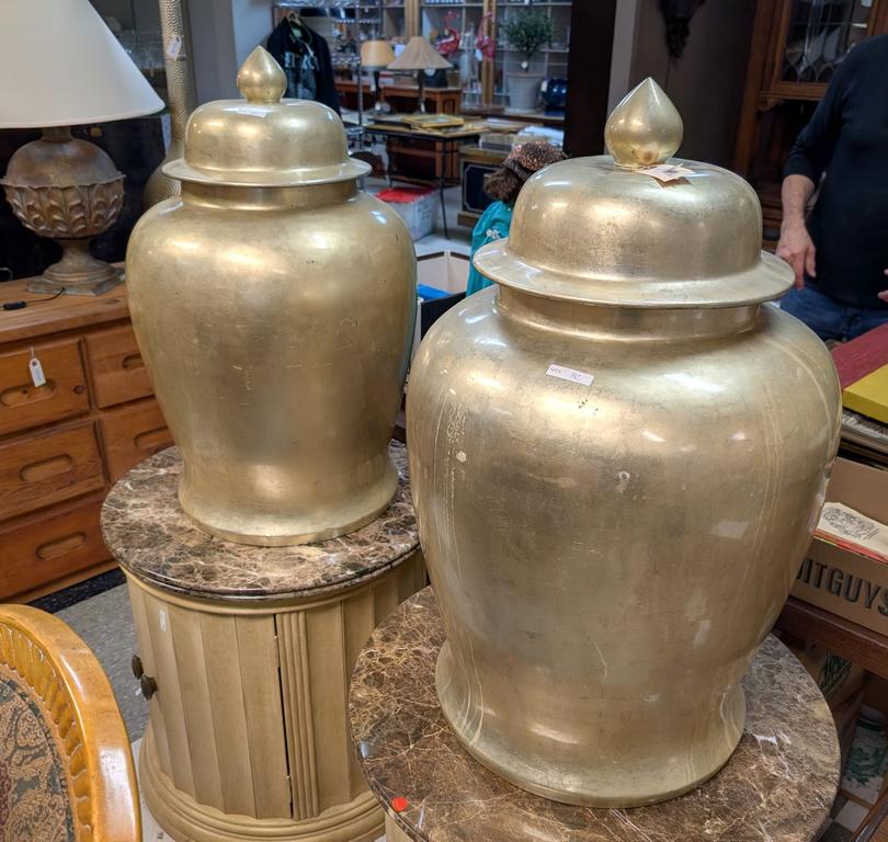 Lot 870: Pair of Large Porcelain Gilt Painted Lidded Urns. 32" X 18"