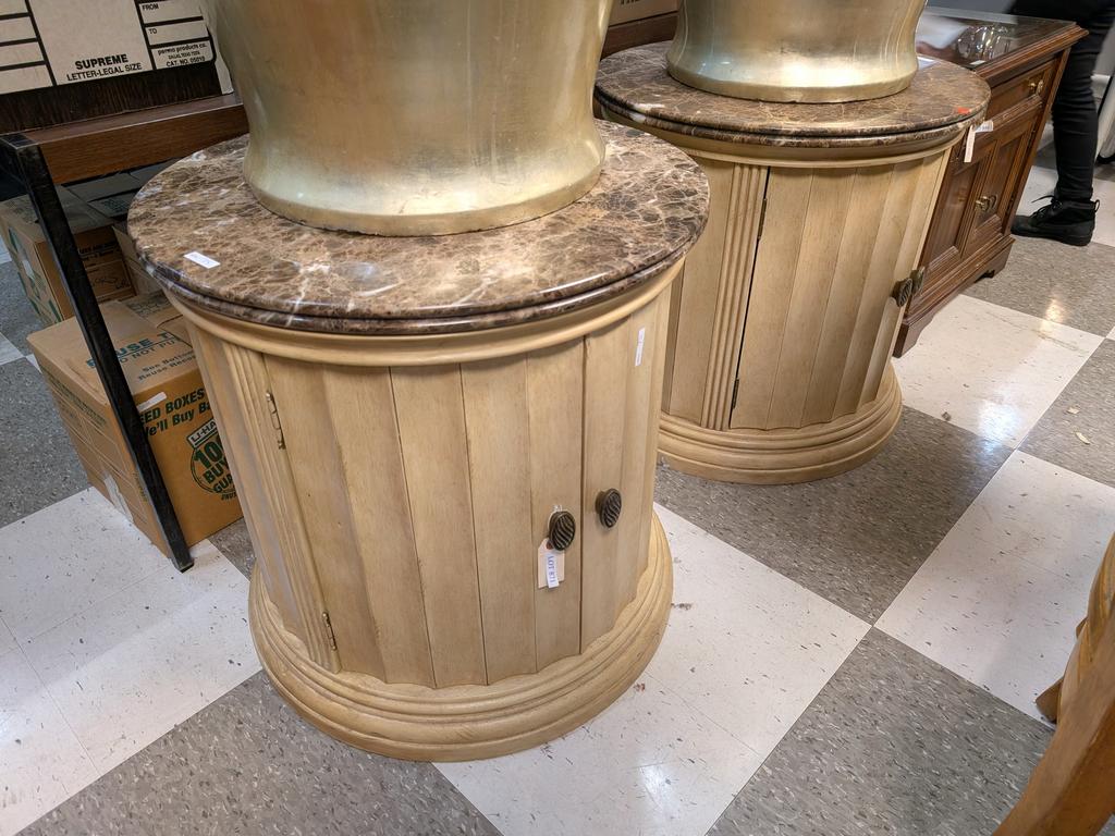 Lot 871: (2) Marble Top Cylindrical End Tables.
