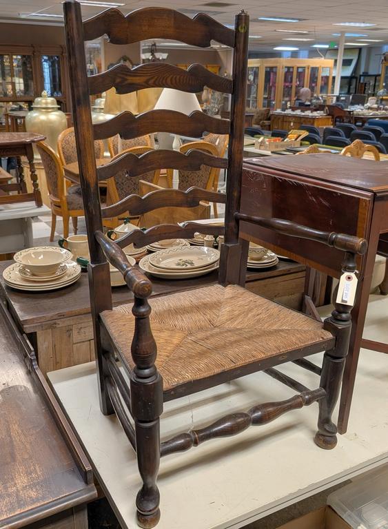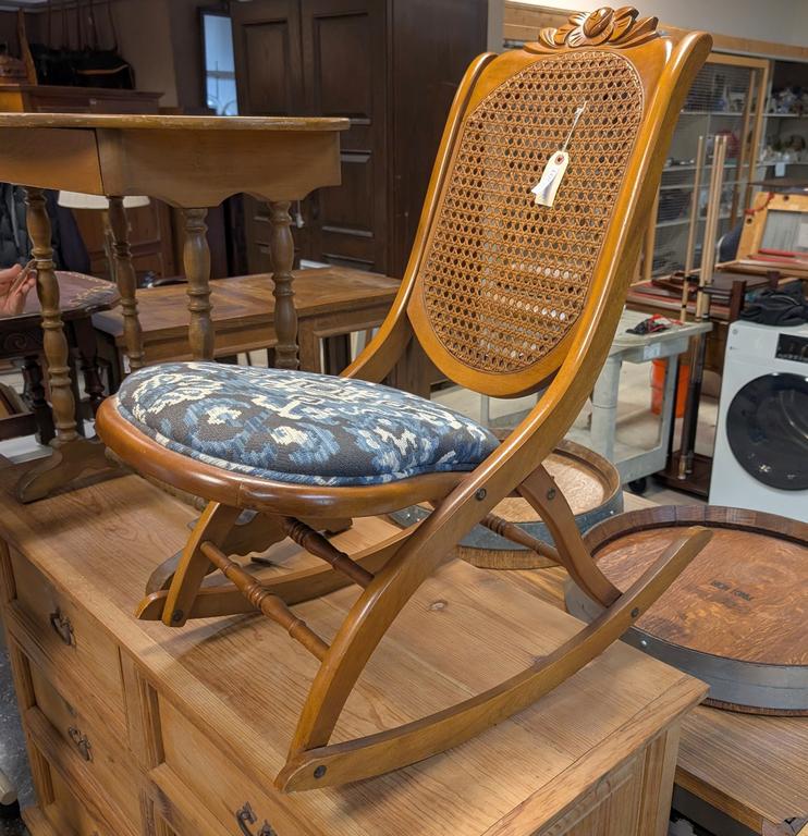 Lot 885: Cane Back Rocker with Blue and White Upholstered Seat.