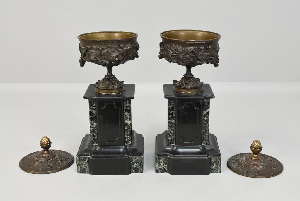 Lot 15: Pair of 19th C. Bronze and Marble Cassolettes.