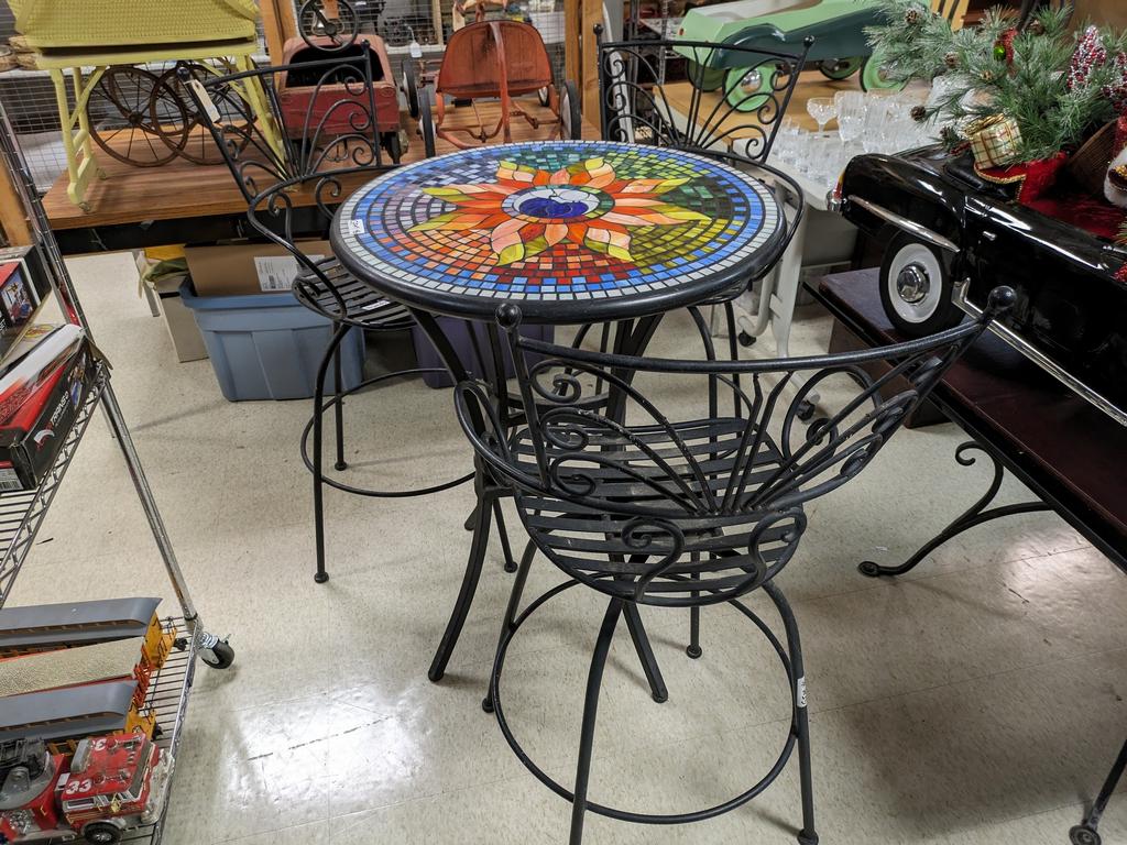 Lot 514: Tile Top And Metal Frame Patio Table With 3 Metal High Arm Chairs.