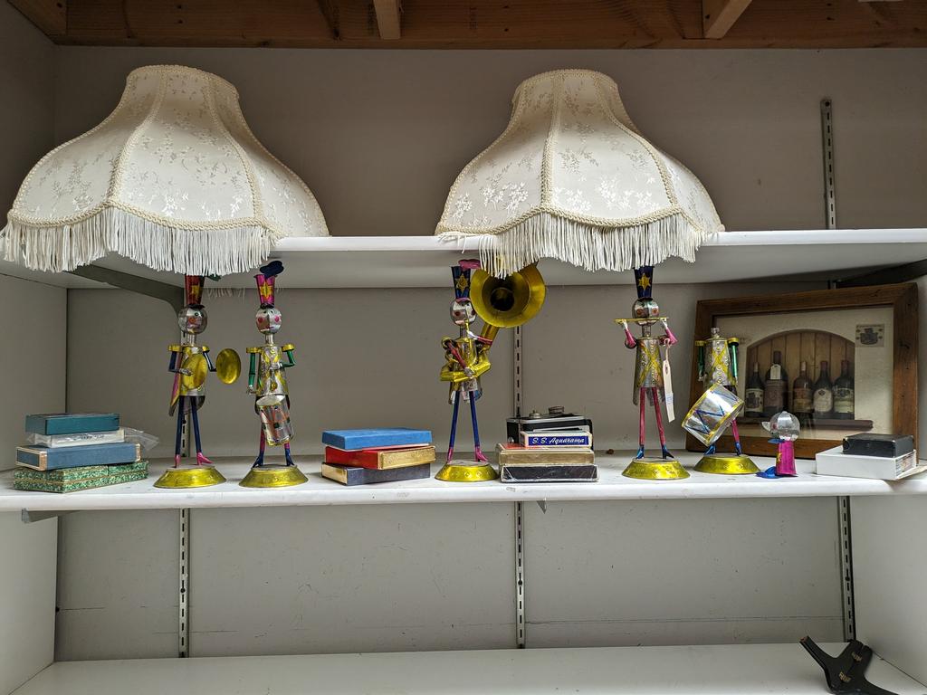 Lot 739: Shelf Of Decorative Items Incl. Metal Musician Figures.