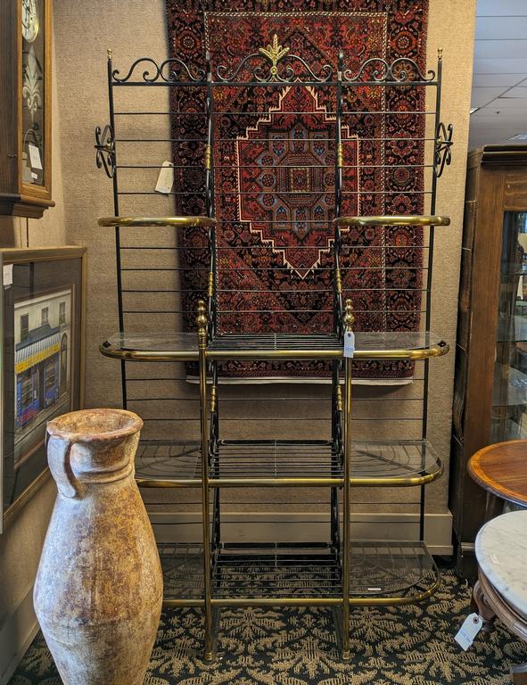 Lot 394: Contemporary Metal 4-Shelf Baker's Rack With Plexiglas Top Shelves.
