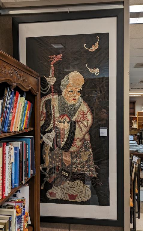 Lot 437: Chinese Embroidered Silk Textile Depicting A Wise Man Holding A Staff With Deer By His Side, With Flying Bats. Robe With Longevity Symbols. 47" X 23". Framed.