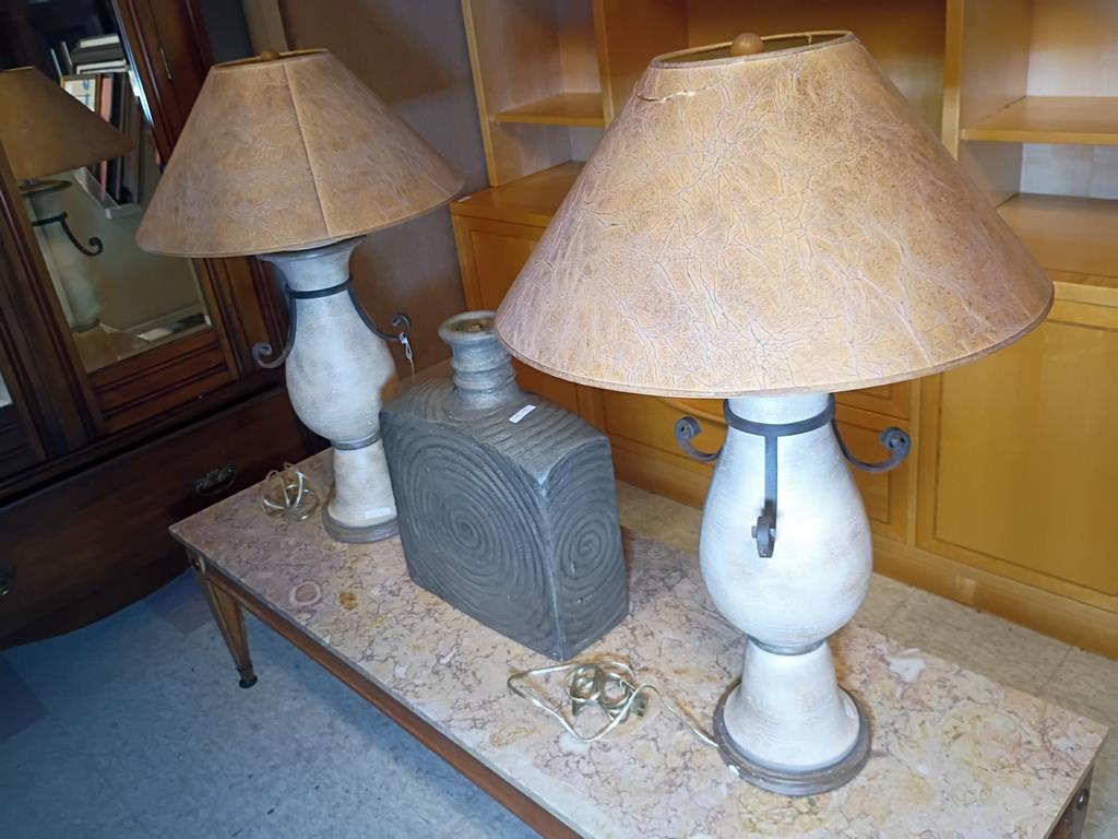 Lot 877: Pair Of Contemporary Table Lamps And A Large Ceramic Bottle.