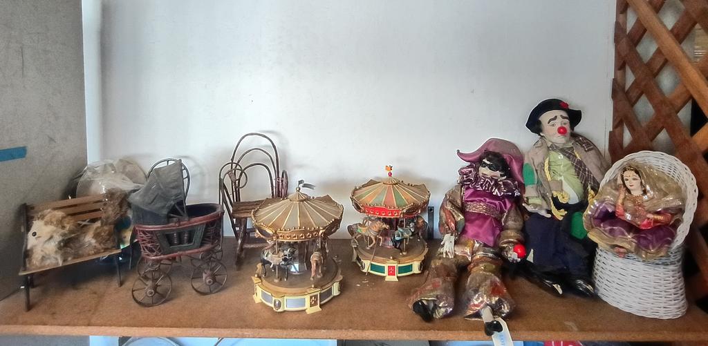 Lot 886: Shelf Of Decorative Items And Toy Carriages.