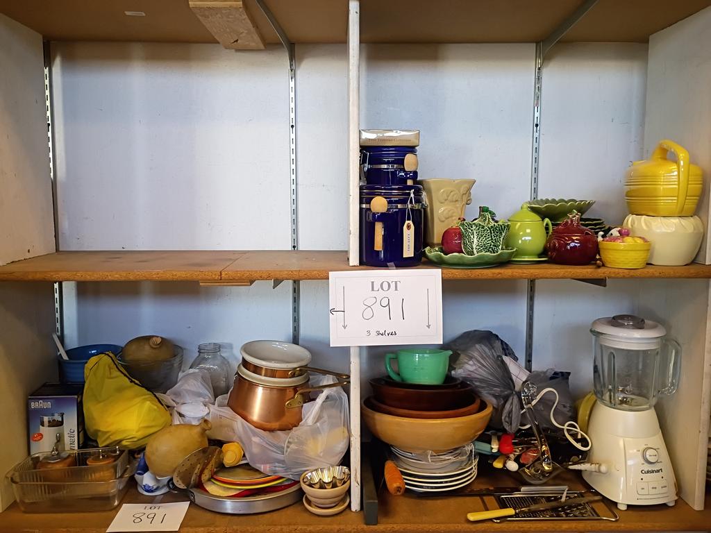 Lot 891: (3) Shelves Of Kitchenware And Dishware.
