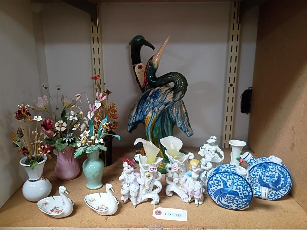 Lot 333: Shelf Of Porcelain Vases, Figures And 2 Cranes Ceramic Sculpture.