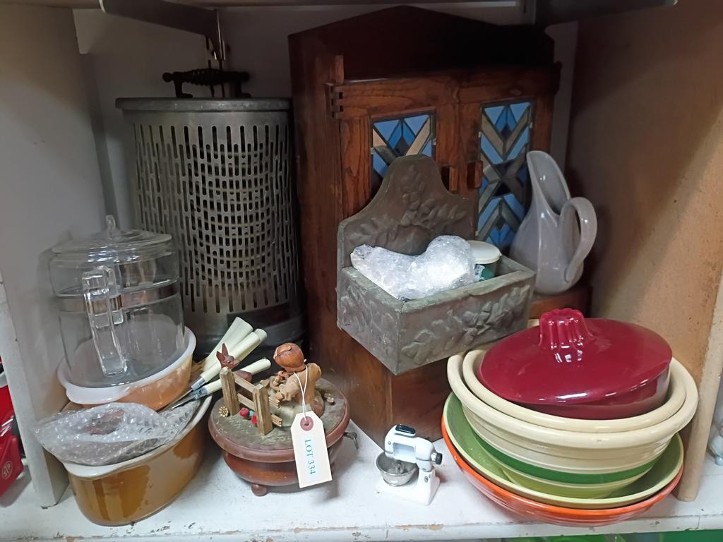 Lot 334: Shelf Of Pottery Bowls And Household Items.