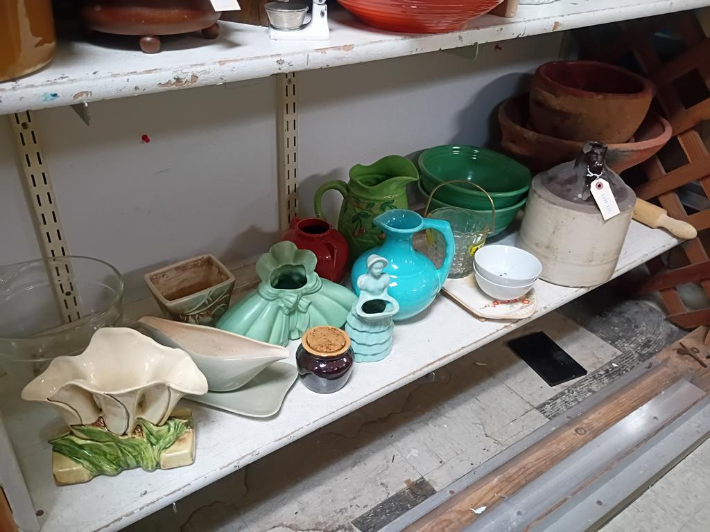 Lot 335: Large Shelf Of Pottery Items Incl. Bauer Mixing Bowls, Crockpot.