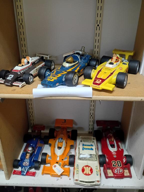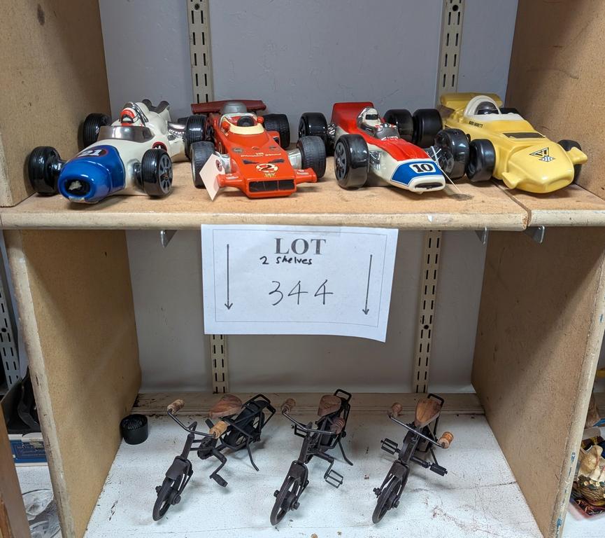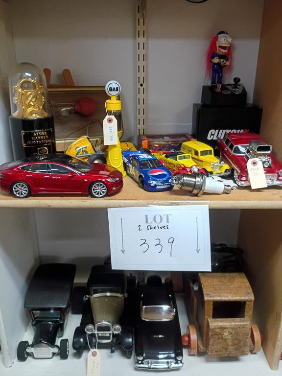 Lot 339: (2) Shelves Of Model Cars, Toys & Automobile Decanter.