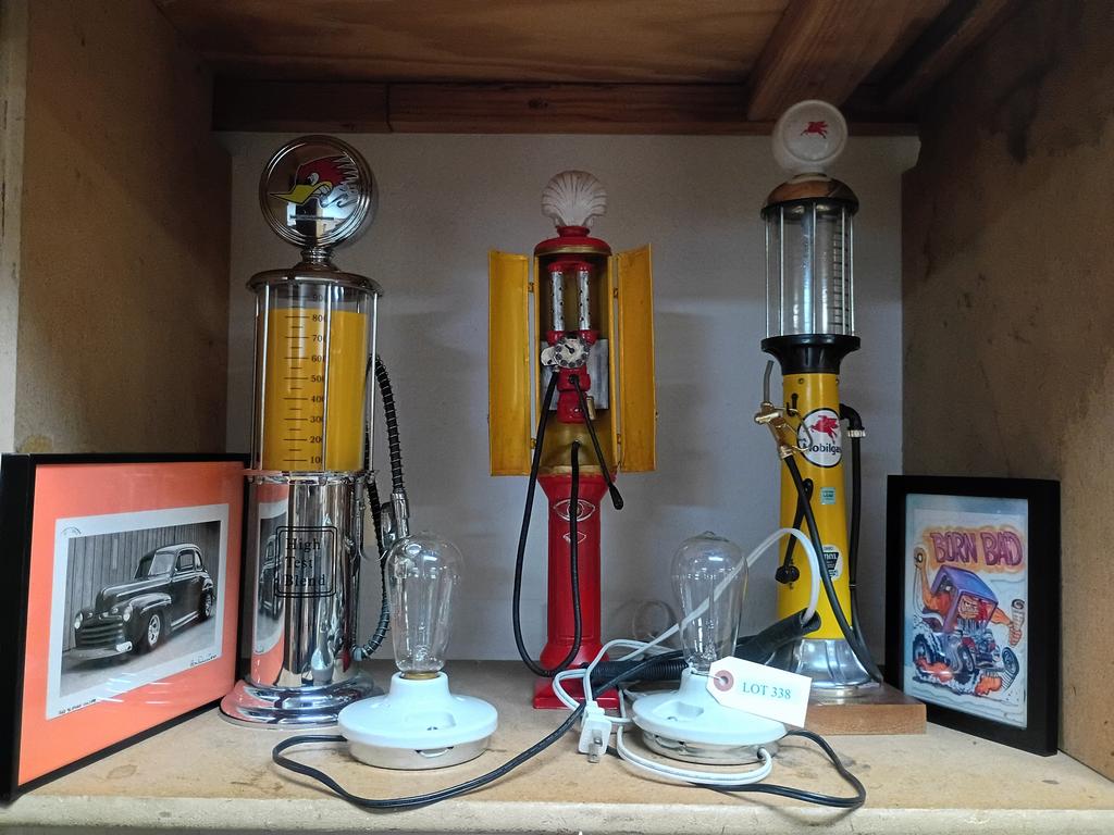 Lot 338: Shelf Of Model Gas Pumps, Lamps And Pictures.