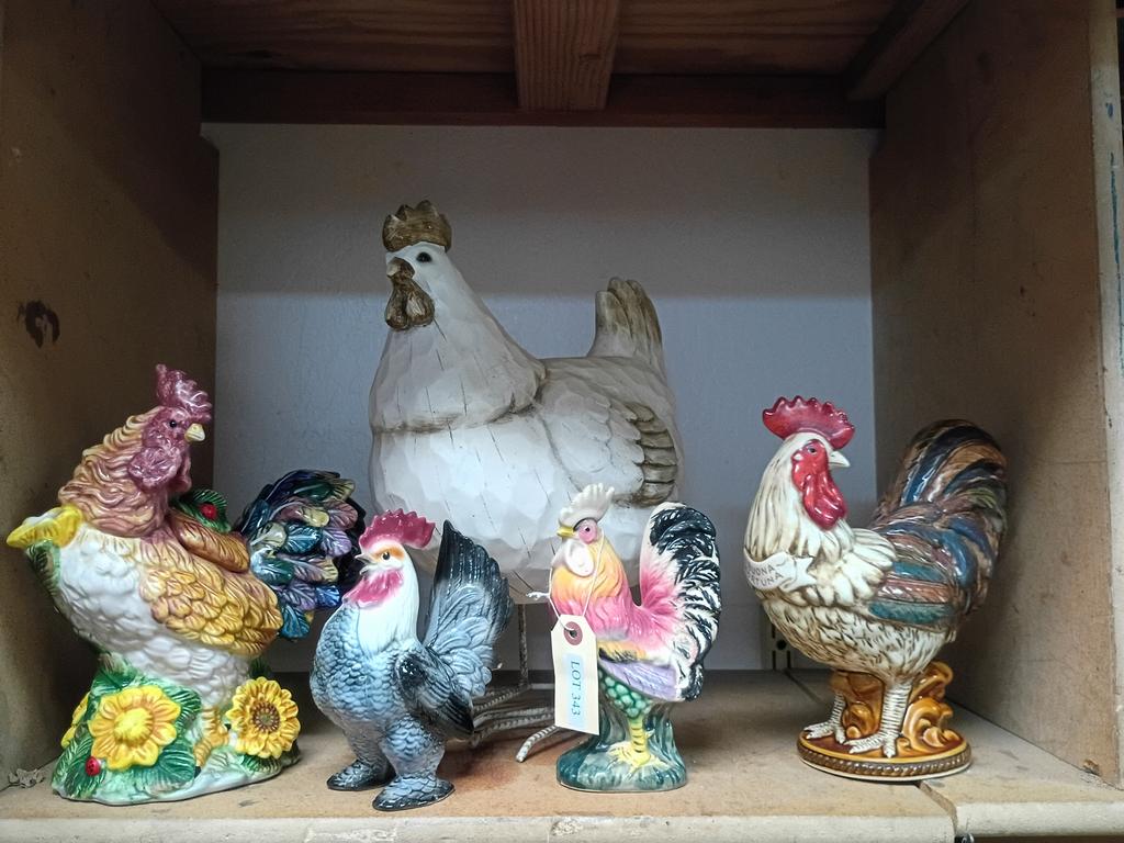 Lot 343: Shelf Of Ceramic Rooster Figures And A Vessel.