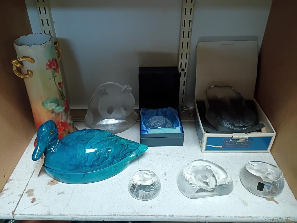 Lot 348: Shelf Of Crystal Paperweights, Ceramic Duck Dish And Vase.