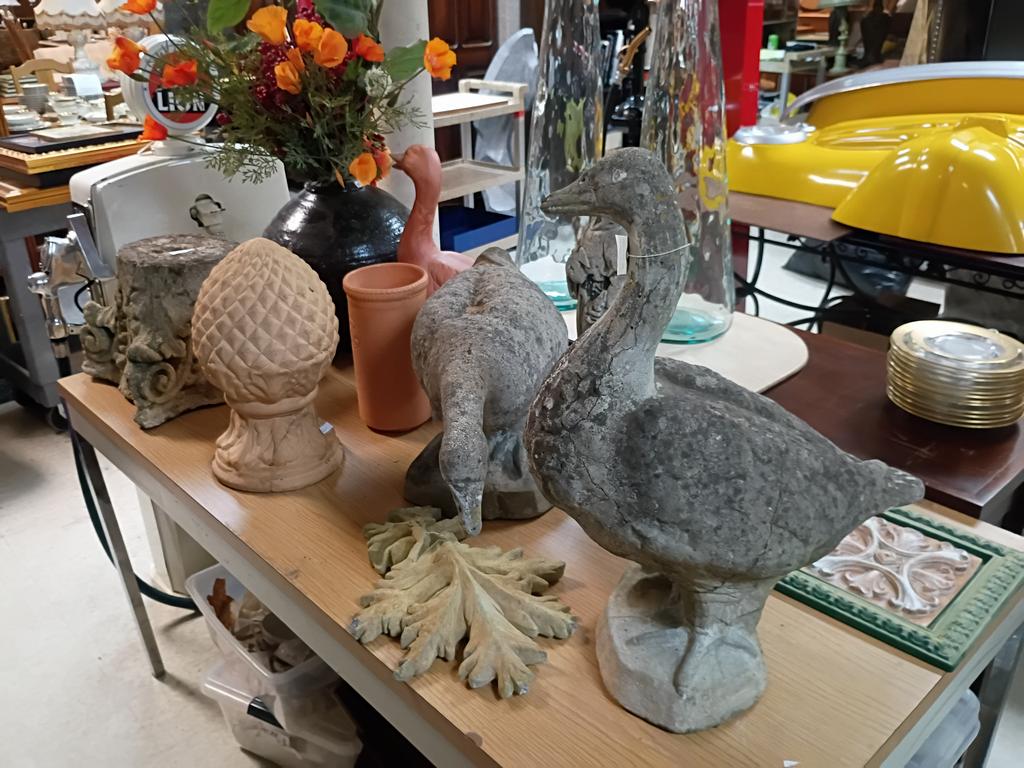Lot 353: Group Of Outdoor Decorations Incl. Pair Of Stone Garden Geese.