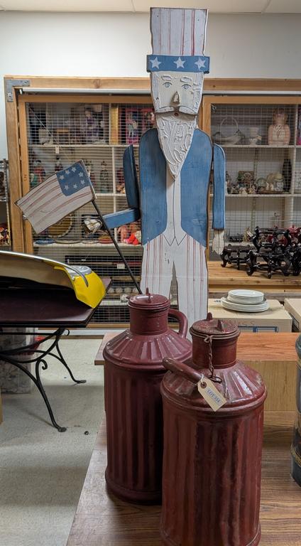 Lot 354: (2) Vintage Red Painted Milk Cans & Uncle Sam Figure.