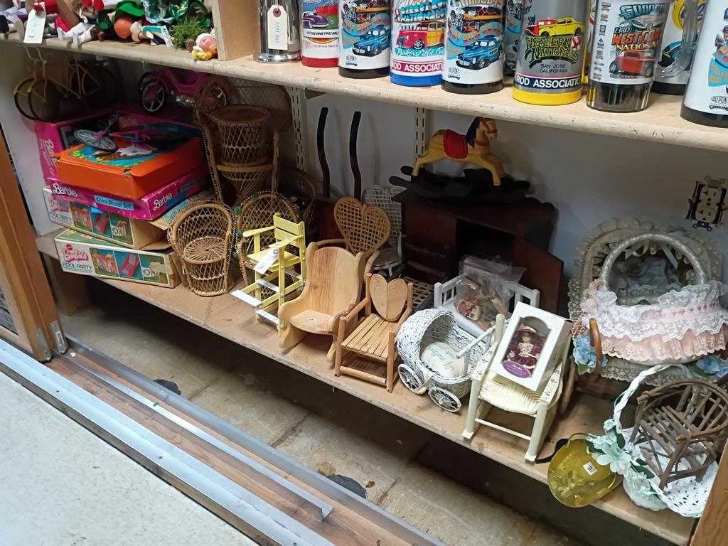 Lot 364: Shelf Of Barbie And Other Doll Accessories Incl. Barbie Bike, Chairs.