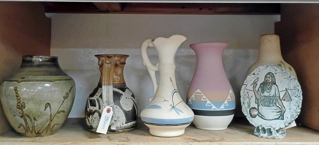 Lot 365: Shelf Of Southwestern Pottery Items Incl. Pueblo Vases.
