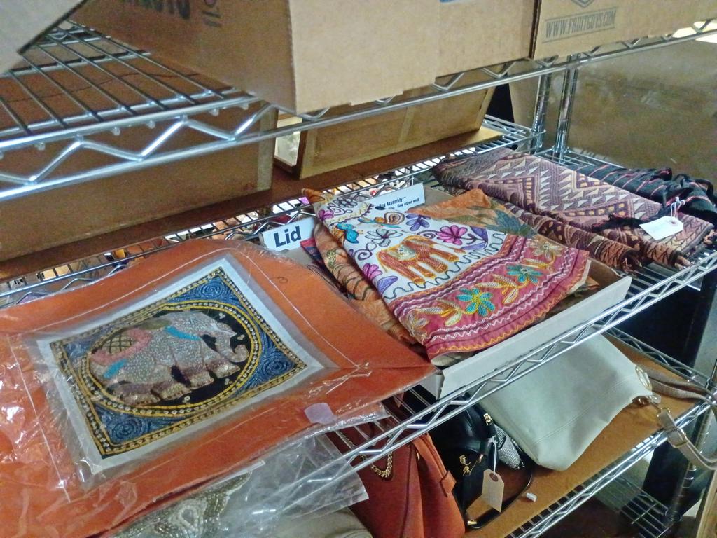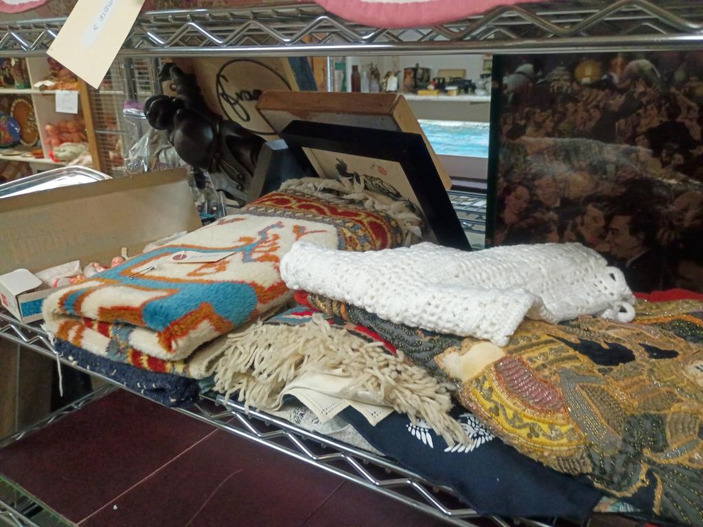 Lot 379: Shelf Of Household Items Incl. Textiles, Small Rugs.