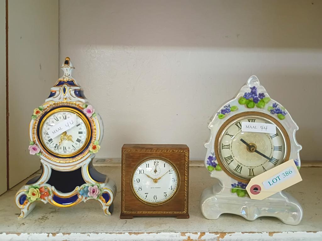 Lot 386: (3) Desk Clocks. (2 Porcelain And 1 Wood Cased).