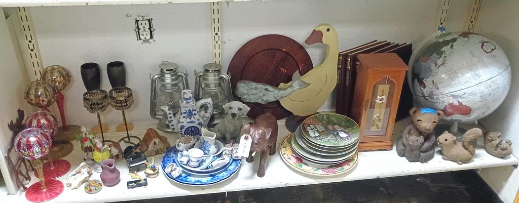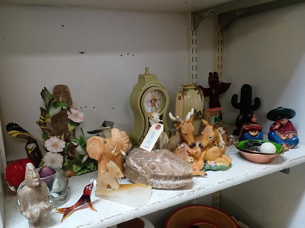 Lot 387: Shelf Of Collectibles Incl. Animal Figures, Clock.