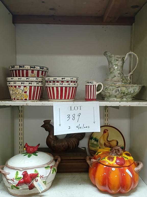Lot 389: (2) Shelves Of Dishes And A Wood Box Incl. Popcorn Set.