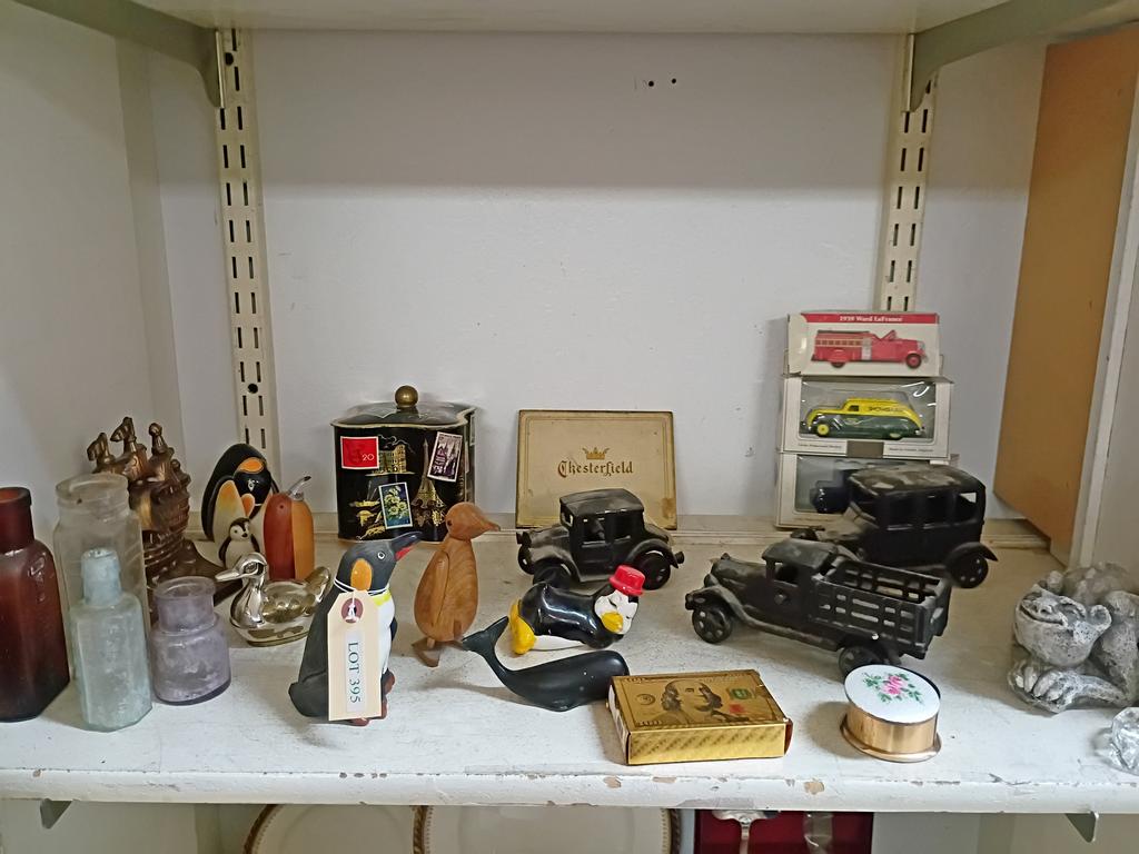 Lot 395: Shelf Of Knick Knacks Incl. Model Cars, Figurines.