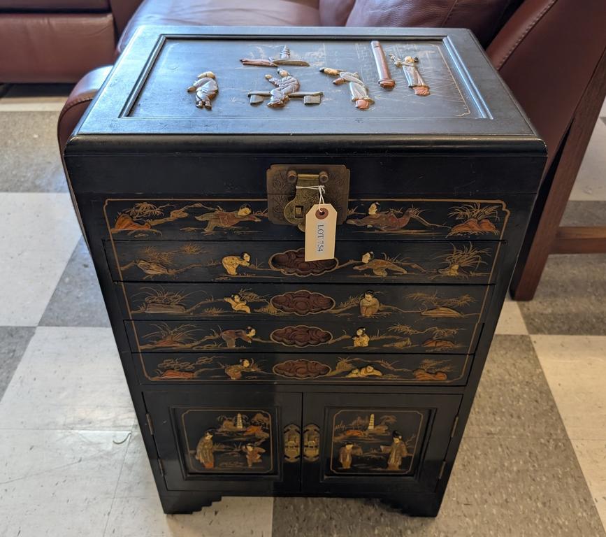 Lot 754: Oriental Black Lacquered Jewelry Chest With Applied Figural Decoration.