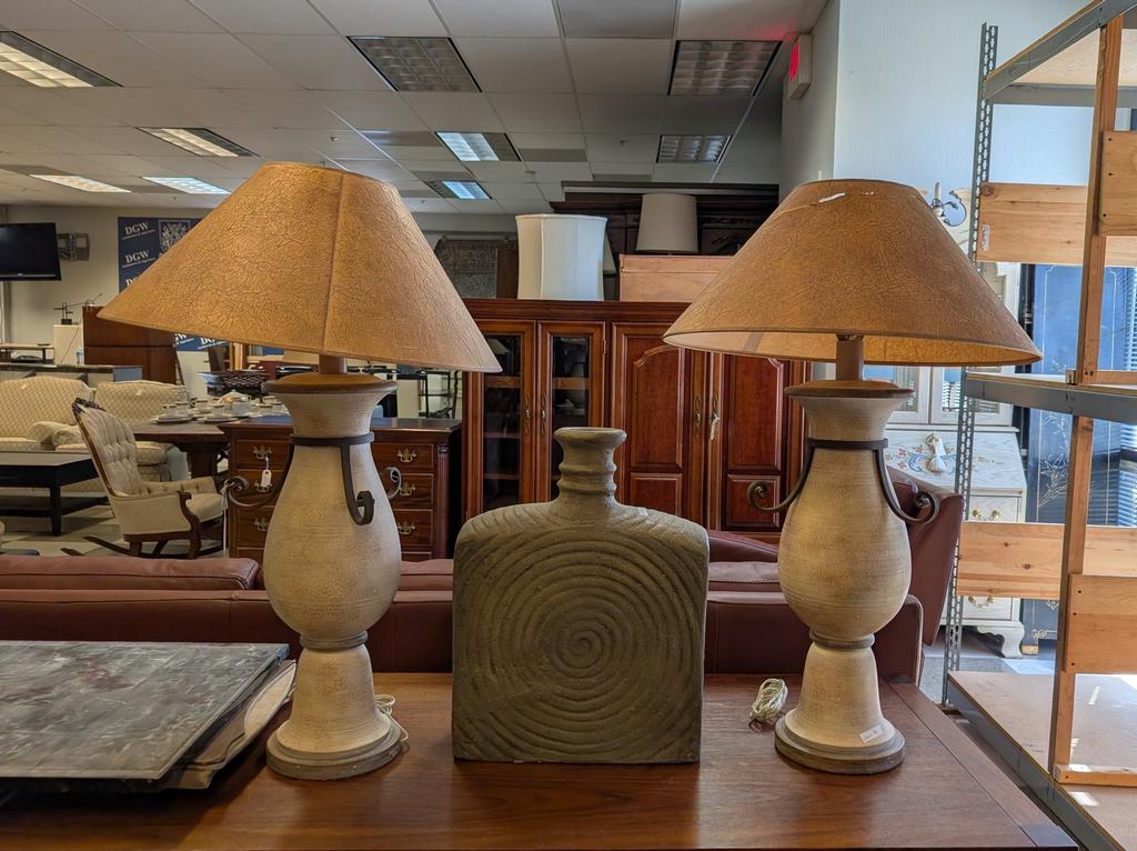 Lot 755: Pair Of Contemporary Table Lamps And A Large Ceramic Bottle.