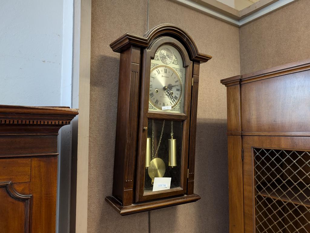 Lot 760: Parliament Wood Cased Wall Clock. 31 Day, Time, Chime & Strike.