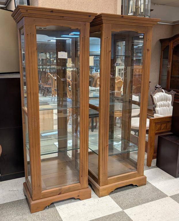 Lot 763: Pair Of Contemporary Pine Lighted Display Cabinets With 3 Shelves And Single Doors. 75" Tall. 16" X 25".