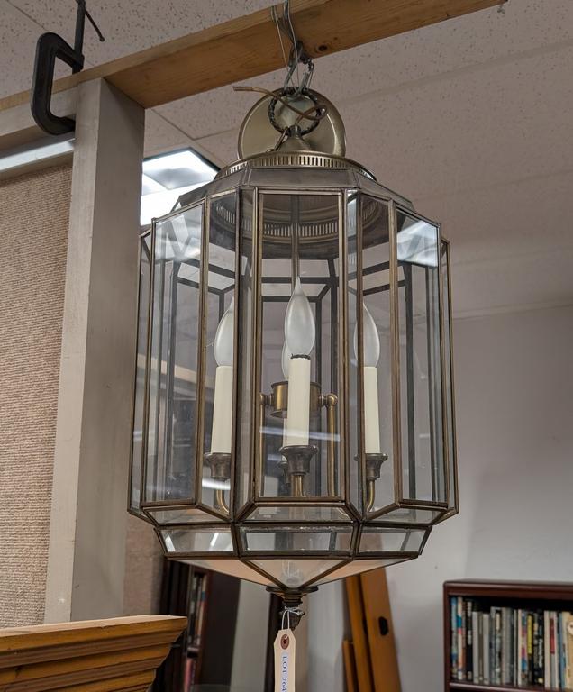 Lot 764: Brass And Segmented Glass Panel Ceiling Light Fixture.