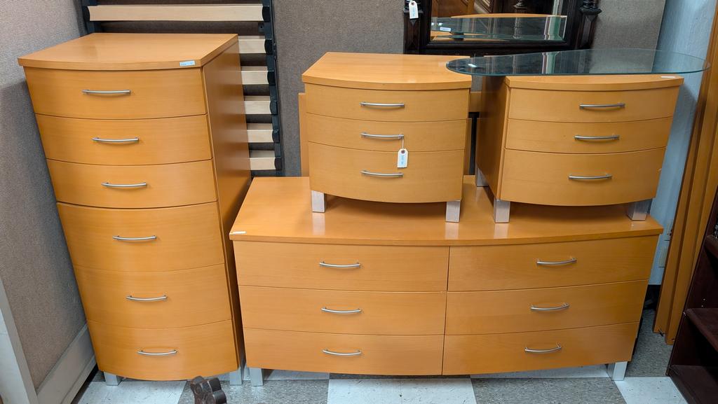 Lot 765: Contemporary Modernist 5-Pc Bedroom Set. 6-Drawer Dresser, Pair Of Nightstands, 6-Drawer Tall Chest And Bed.